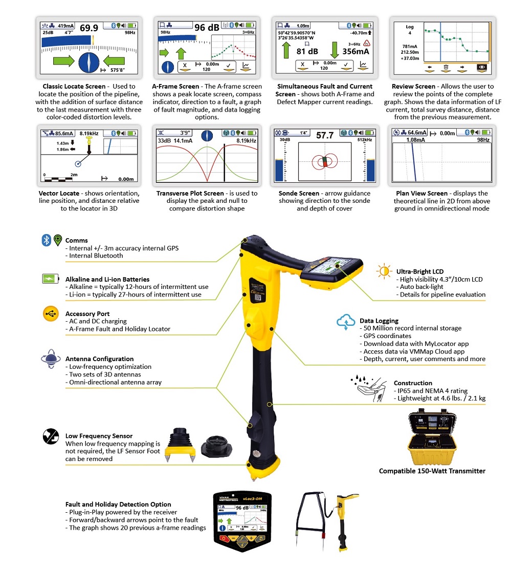 The vLoc3-DM is used to precisely locate pipelines and assist in evaluating pipe coating defects. The system can be used on either transmission or distribution systems. A complete ACVG survey can be undertaken using the vLoc3-DM and plug-in A-frame. The display on the vLoc3-DM has been configured specifically for pipeline evaluation. Data can be graphed in real-time on the receiver while still on site. The walk back feature highlights the operator’s position on the graph allowing them to return to the point of interest where further evaluation or an ACVG, A-frame survey can be undertaken.